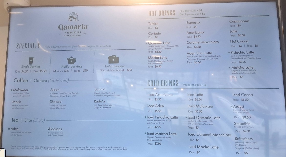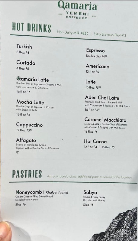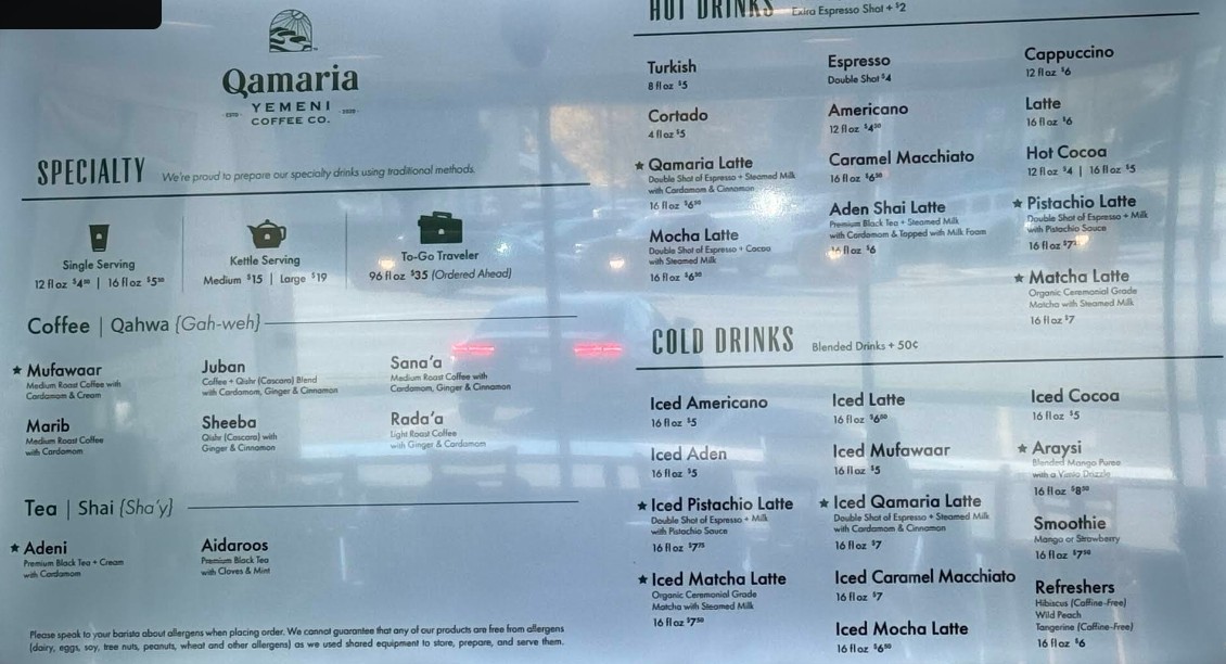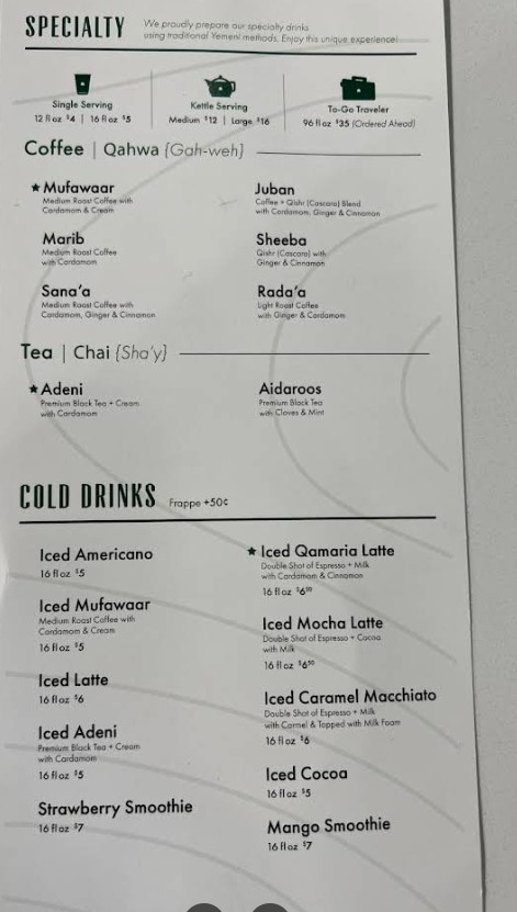 Welcome to Qamaria Yemeni Coffee Co., where tradition meets modern café culture. The Qamaria Yemeni Coffee Co. Restaurant menu offers a rich selection of authentic Yemeni coffee, premium teas, handcrafted desserts, and specialty beverages inspired by centuries-old brewing techniques. Known for its aromatic beans sourced from Yemen’s highlands, this café delivers a unique and flavorful experience in every cup. Whether you’re looking for a relaxing coffee break or exploring Middle Eastern flavors, Qamaria Yemeni Coffee Co. in Chicago Ridge is the perfect destination for coffee lovers and dessert enthusiasts alike.